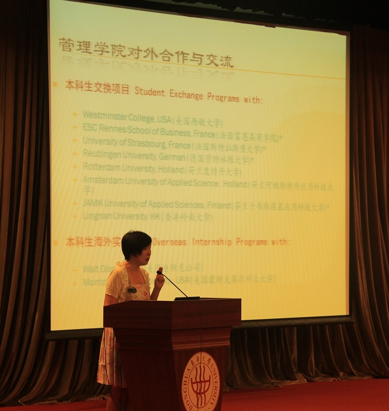 9月18日下午,由学院副院长沈蕾老师带队,学院喻葵老师、周静老师、花蕊老师一起为2014级大一年级500多名新生举办介绍学院国际交流的宣讲报告。