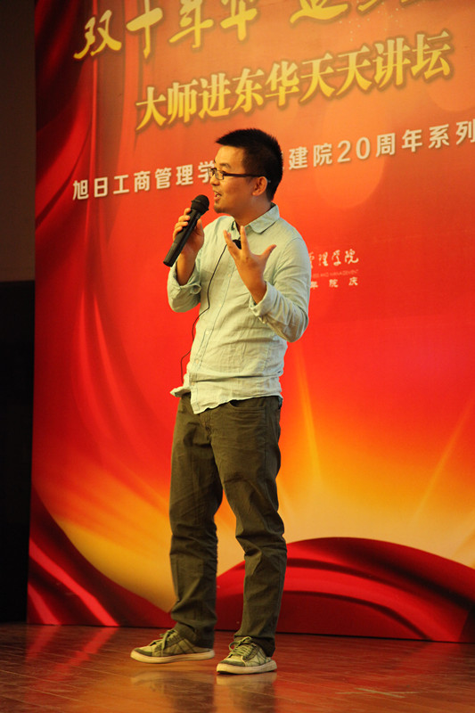 2014年10月17日晚18点30分,旭日楼400报告厅已座无虚席,来自延安路校的本科生、硕士、博士研究生、MBA学生、各界校友和部分教师共同期待着 “双十年华 逐梦远航”大师进东华天天讲坛最后一讲压轴开讲。最后一讲的主讲人成荣(洪烈)先生,现任前不久在美国震撼上市的阿里巴巴集团商务总监。成荣(洪烈)先生拥有八年传统商业从业经验,历任Baxter,Nestle等世界500企业市场经理,渠道经理等职。他于2009年加入阿里巴巴,先后担任阿里软件资深市场经理,B2B业务总监,负责SaaS软件的市场和运营,之后全面负责淘宝网生活服务、社区联盟、B2C入淘以及全网联合营销等各项电商业务。