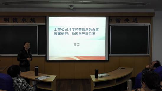 高芳老师首先从上市公司信息披露问题谈起,引出信息披露的理论基础以及研究的对象、重点和研究的意义。接着是信息披露的动因分析,包括融资需求、同行披露、经营周期几个方面。最后以股票市场和权益资本成本为例,向我院师生分析了信息披露的经济后果。
