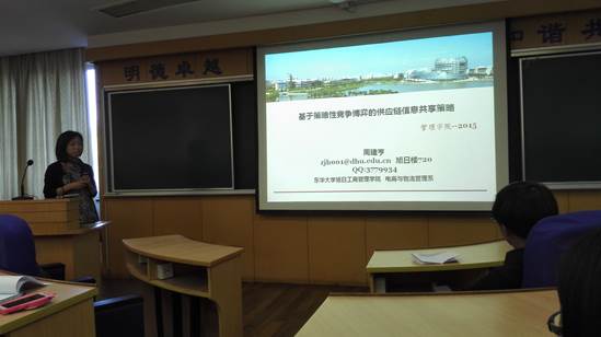 5月5日下午2:30,我院第三期青年教师优秀学术成果交流会在旭日楼306如期举行。主讲人为周建亨和王志宏副教授,交流会由姚洪心副院长主持。周建亨老师的学术交流以“基于策略性竞争博弈的供应链信息共享策略”为主题,王志宏老师以“商业信用和收入共享组合合同下集成服务提供商与其客户间的协调”为主题。我院张科静、刘峰涛、马彪、曹海生、王晓锋、王长军、贾永基、沈滨、李庆颖等老师和众多研究生参加了此次讲座。