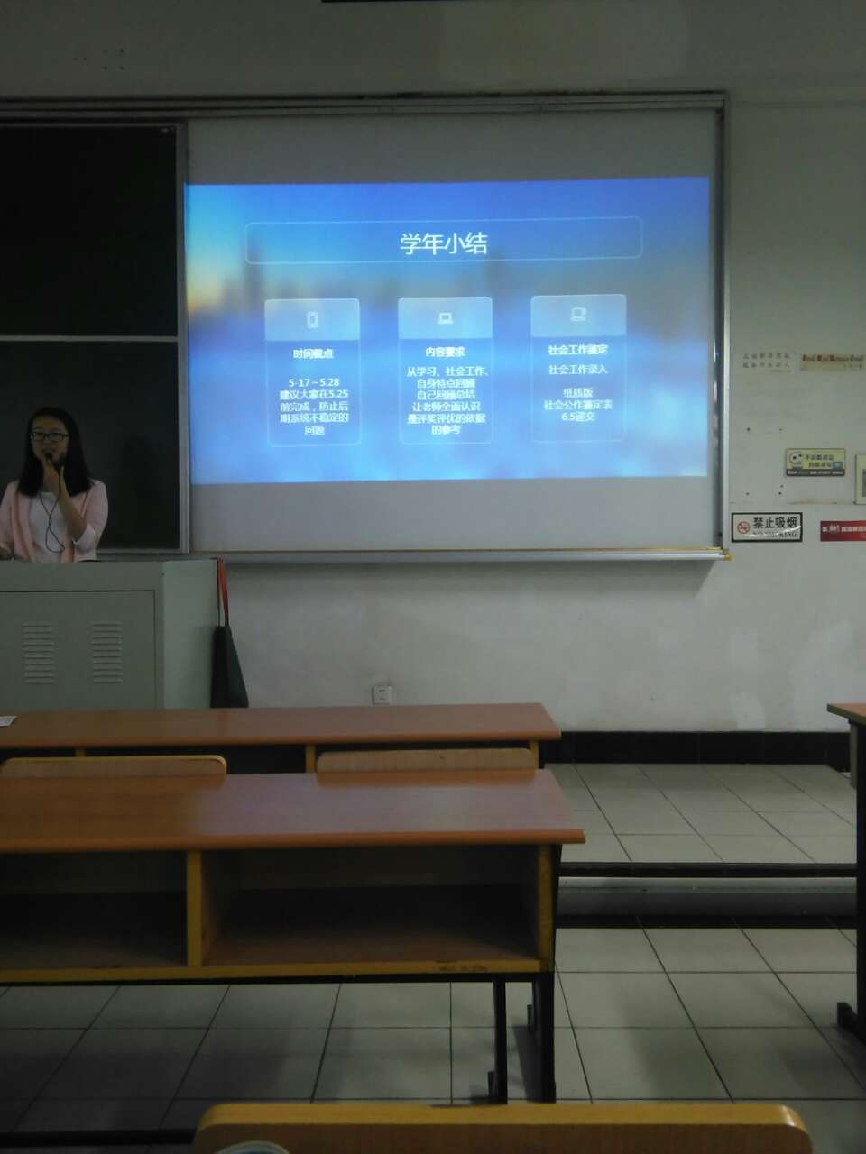 首先是学年小结工作介绍。根据PPT上的内容,纪老师再次强调了学年小结的重要性以及时间节点的掌控:学年小结要从学习、社会工作、自身特点等方面回顾这一学年的生活,是让老师全面认识自身的一个重要途径,同时更是评优评奖的依据参考,所以要务必重视,必须在5月17日-28日之间完成,尤其建议在25日之前完成。其次要在6月5日之前上交社会工作纸质鉴定表。