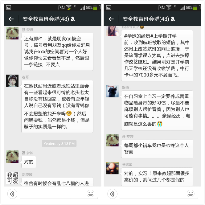 2015年5月17日晚,为切实加强同学们的自我安全保护意识,金融1201和金融1202班紧紧围绕“校园安全教育”这一主题,在寝室间交流分享身边安全隐患及案例的基础上,我们在班群里同样展开了热烈讨论。同学们踊跃发言,讲述了自己的亲身经历和听说过的相关事件,引起了大家的共鸣。同学们提出的案例主要涉及了寝室防盗、夜归防狼、网络诈骗、短信和电话诈骗、地铁站和商场诈骗、实习诈骗等,并提出了相应的应对措施。