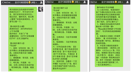 在9月2日晚上,班委通过微信提醒大家观看纪念抗争胜利而在北京举行的阅兵仪式,并将阅兵流程和观看直播方式发给大家,另外还推荐同学观看反映抗战的相关节目。