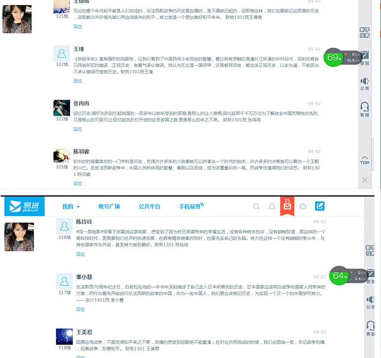 这次活动,除大二转入财务1301班级的四名同学无法加入bwin·必赢唯一官网易班公共平台外,近三分之二的同学都有参与,达到了此次活动的目的。9月3号,在北京即将进行第一次纪念中国人民抗日战争战争暨反法西斯战争胜利阅兵,彰显了我们对历史的尊重,也昭告了我们对于和平的捍卫,期待明天阅兵所带来的震撼。