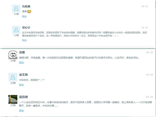 活动开始,辅导员在易班平台的班级群里发布中秋主题公告。在主题公告中为我们介绍了中国优秀的传统节日中秋的起源由来、典故,并为我们科普了具有地方特色的月饼。为班级中不管是身处异乡的,还是上海本地的同学送上了一份贴心的祝福。同时,同学们以回帖的形式分享了自己在大学度过第一个中秋时的所想所感。李梦杰同学说:“第一次一个人在外过中秋,思乡之情只有对月才能抒发,古人的心境大抵如此吧。希望天下家人都能团团圆圆,和谐幸福。最后,吃个月饼!”常心宇同学觉得学校发的月饼让她感到十分温暖:“虽然没有回家依然感到了各种温暖。我还要给爸妈打个电话,说一声我想他们。”徐康同学留言:“婵娟冷殿,月兔捣寒。第一次体验到无法团圆的遗憾。希望天涯四处的游子们共赏共思乡。心在何方,家就在何处。”同学们在回帖中表示独在异乡,月是故乡明的孤独,但更多的是一个人出门在外的独立和在大学新班级家庭中的幸福与期待。吾心安处是故乡,当我们抬头望向同一轮明月,我们便可以互相陪伴。在一片其乐融融中,师生共度美好的中秋之夜。