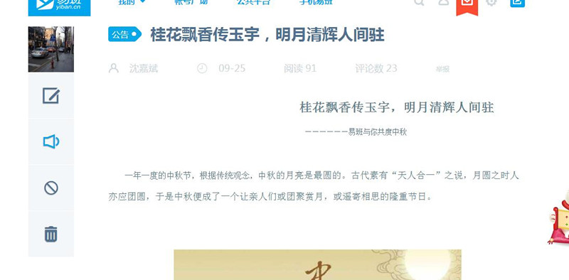 随着中秋佳节的到来,为了增进班级凝聚力和师生关系,推动班级进一步发展以及对中国优秀的传统文化的推广和传承。2015年9月25日至9月27日间,旅游1501班的同学在学校和辅导员的组织和带领下在易班线上进行了“桂花飘香传玉宇,明月清辉人间驻——易班与你共度中秋”的主题活动。