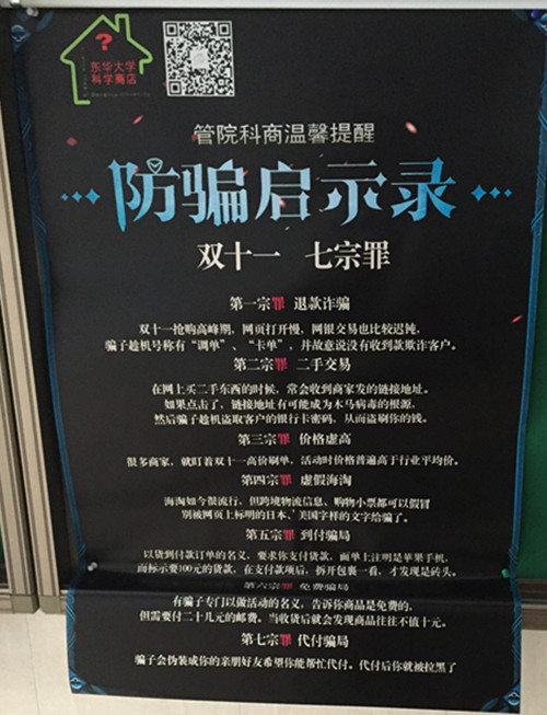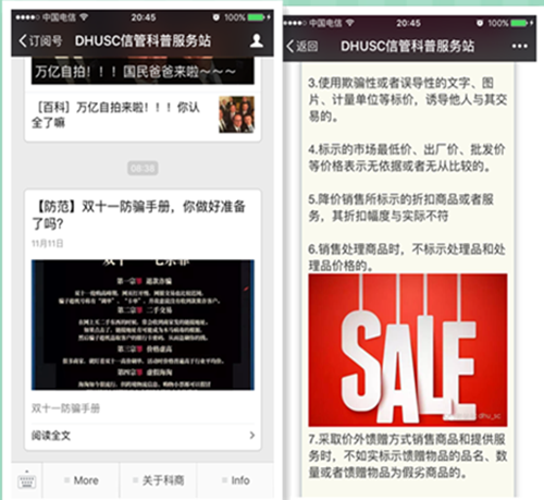“双十一”当天,科学商店的微信平台“DHUSC信管科普服务站”也相应地发布了关于防诈骗的推送,推送内容详细讲述了当前黑心商家惯用的手段以及应对措施,使同学们在快乐网购的同时擦亮眼睛,避免不必要的经济损失。