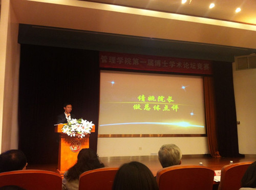 2015年11月3日周二下午18:30分,管硕152班的同学积极观摩了在bwin中国官方网站旭日楼400举行的管院第一届博士学术论文竞赛。此次竞赛邀请了管院各个专业不同学术领域的专家教授组成阵容庞大的评委团,亲临现场对参赛的博士论文进行点评,如姚洪心教授、顾庆良教授、宋福根教授等,以及组织此次博士论文竞赛的众位老师共同参与,如王丽华老师、周蓉老师等。