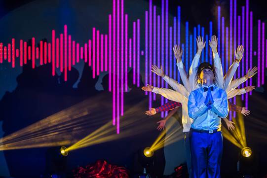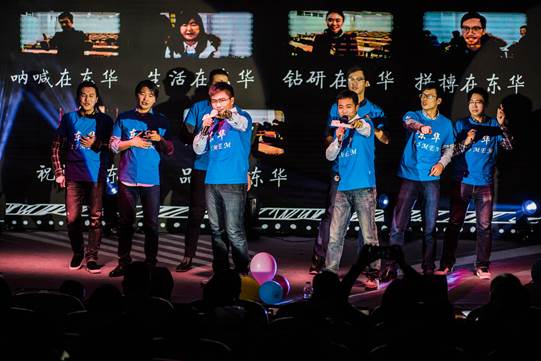 2015级MEM班的男神们以一曲《青春组歌》率先暖场,英俊潇洒的男神吸引了台下所有观众的目光。《同桌的你》温情四溢,《青苹果乐园》朝气蓬勃,令人不禁随着节奏轻轻摇摆。曲毕,男神们在台上画出东华同心圆,送出全班最美的新年祝愿——“祝福大家新年快乐,预祝东华再创佳绩”。