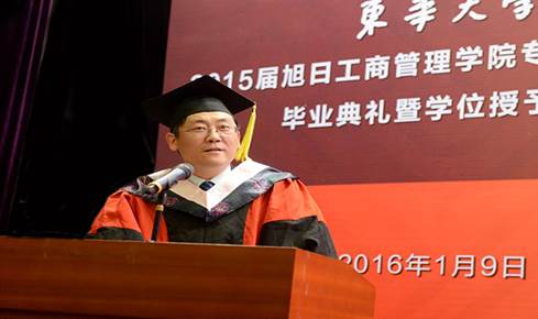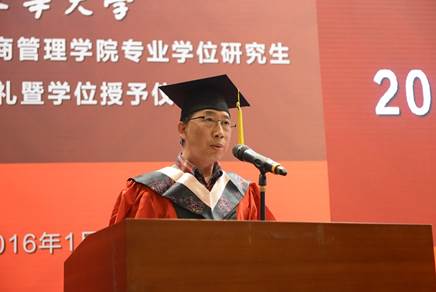 首先是副院长赵晓康致辞,他代表学院对同学们取得的成就表示由衷的祝贺,为全体毕业生感到由衷的骄傲。他告诫毕业生们,要感恩父母的养育,感恩老师的培养,感恩身边同学朋友,用感恩的心去工作和生活。他说:“你们要为自己鼓掌,因为2年半的时间里,你们刻苦学习付出了很多;要为家人鼓掌,今天台下有不少家长、亲人来参加毕业典礼,各位同学一定要记住,他们是此生最疼爱你的人;要为老师鼓掌,在这2年半的时间里,老师们辛勤培养了你们,牺牲了无数双休日来上课;要为同学鼓掌,因为身边同学的刻苦学习也是一种榜样和激励,是一种极大的鞭策,提醒自己不能安于现状,止步不前。”