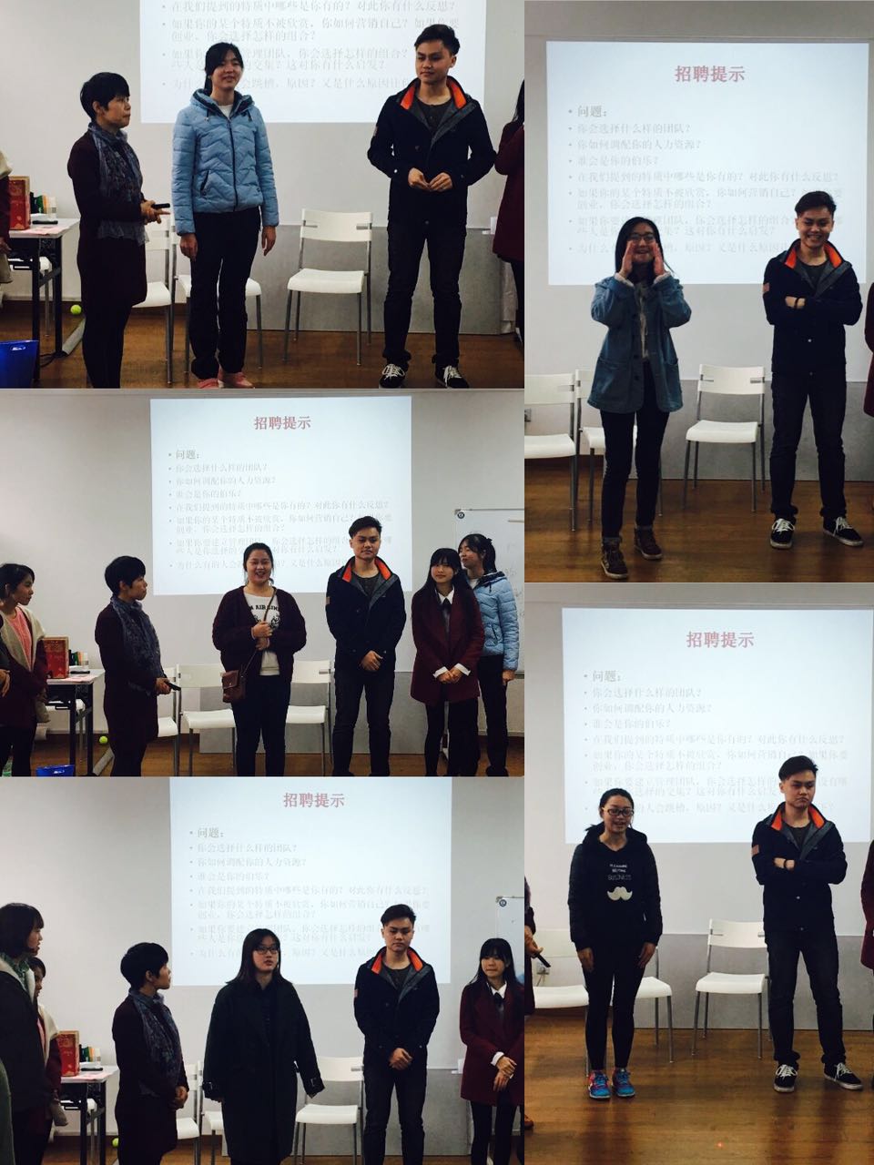 招聘环节结束后,进入第三个环节——职员任命和公司定位。全班同学一共分为四个公司,各个公司围城一个圈进行六分钟讨论。首先讨论公司的定位,然后由老板来对每个“员工”进行职务任命。讨论结束后,由每个公司的老板来向大家阐述自己的公司的定位,以及每个员工的职务和安排其担任这个职务的理由。在这个环节中,同学们不仅想象力丰富,而且经营学的感念已经有了雏形。特别对于每个老板,可以看出他们每个人对于每个员工的“特点”的不同看法、理解,从而有了相同的特点不同的职务的现象。这就说明了,在人才招聘的时候,每个企业的每个HR对个人会产生不同的理解,怎样让自己能脱颖而出并且让人认可,是一个我们需要从这个环节以及往后学习的。阐述完毕后,王老师提出了一个补充环节——员工挑选老板。或许有员工不喜欢自己被老板赋予的工作职位,在这个时候,王老师让四个老板排成一排背对员工,让每个员工选择自己的老板。最后有一位同学选择了“跳槽”,因为这个员工对于自己的原来工作并不喜欢而且另外一个公司所缺的人才正是这个员工的兴趣所在。面对员工跳槽的现象,王老师让前老板进行了感想发言。