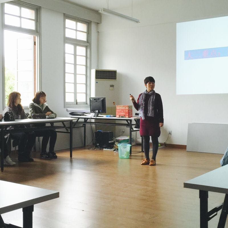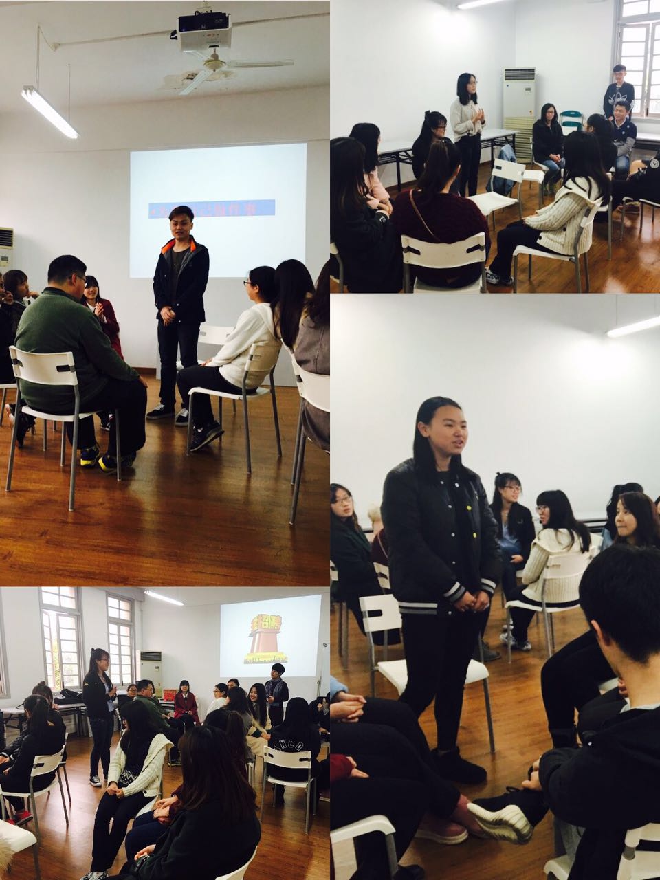 此次活动只要分为四个环节。首先王丽华老师为现已是大二的同学们,进行了定位,告知同学:大二是一个需要自我探索的一个时点。正是需要自我探索,所以王丽华老师让我们进入第一个环节——为我自己做件事。王老师安排学生分别报数并组成四个小组,每个小组围成一圈,选出下面环节的主导人物小组长,并要求每个组员进行自我介绍,介绍自身三个优点,其余作为听众的同学需要给予对方鼓励和赞美,最终再从每个小组选一个代表向全班进行自我介绍。在这个环节中,平时不太熟悉的同学们展现出了自己不被人知的却是独特的优点。第一个环节可以说作为热身,增进了同学之间的了解,也探索到自我身上的特点。