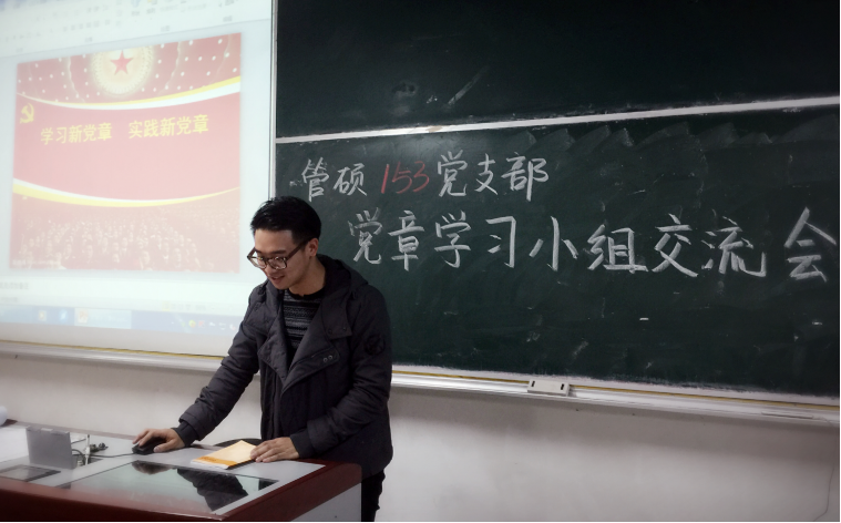 管硕153党支部的活动内容围绕党章学习进行了入党积极分子的学习汇报,感动中国人物精神的学习交流。积极分子们对党徽党旗、党的纪律、党的组织制度等内容进行了学习汇报,并将学习党章过程中留下的疑问与收获的心得与大家进行了分享。管硕151党支部则围绕习党的十八大会议精神等内容开展了本次活动。支部副书记张雪颖给所有组员简单温习了党章的主要内容和历史沿革,她以“一大”到“十七大”为主线,带领同学们再一次了解了党章党史的发展过程;随后,她又带领同学们重点学习了“十八大”确立的新党章。