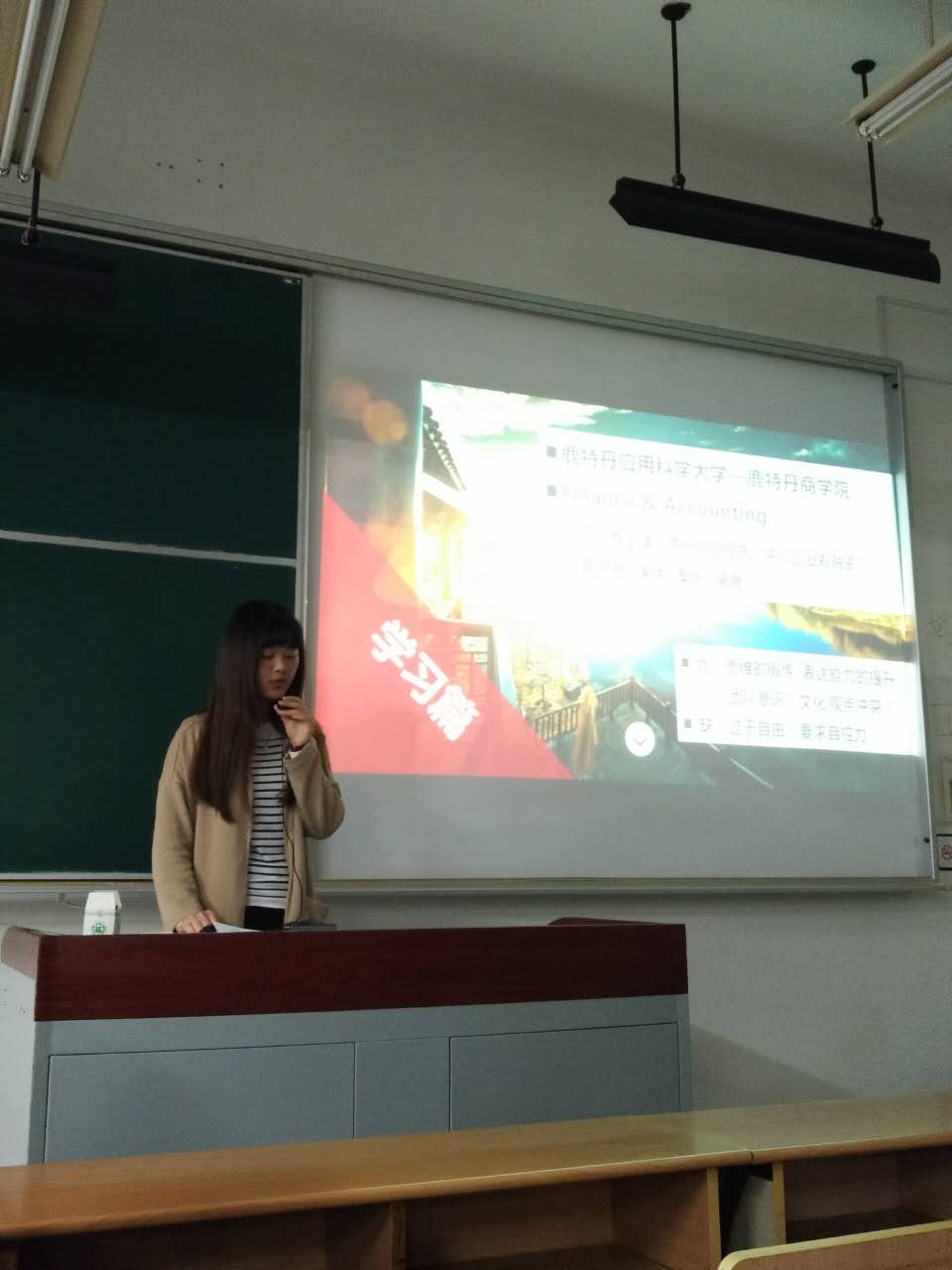 紧接着分享的是法国雷恩项目的金健同学,金同学首先介绍了法国雷恩高商的校园环境,接着讲述了自己在学校写报告,做小组作业和考试的经历,然后分享了跟不同国家不同地区的学生同住或出游见到各国朋友时的一些有趣事件,最后也描述了自己交换半年的收获,同时对想要去法国的同学提出了十分有用的建议,相信在座的同学们一定收获不小。