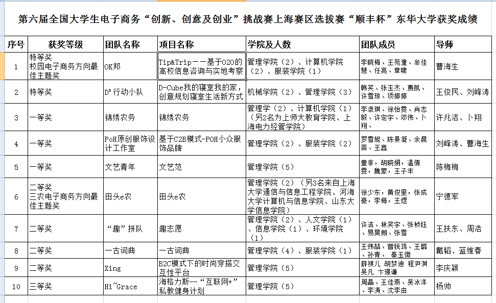 最终,来自bwin中国官方网站“Tip&Trip--基于O2O的高校信息咨询与实地考察”和“D-Cube我的寝室我的家,创意规划寝室生活新方式”、等六个团队项目获得本次大赛特等奖;上海健康医学院等12个团队项目获得一等奖;上海财经大学等24个团队项目获得二等奖;华东师范大学等36个团队项目获得三等奖。我校bwin·必赢唯一官网刘峰涛、曹海生、机械学院王俊民等7位老师获得了最佳指导老师奖。大赛还颁发了旅游电子商务、互联网金融、健康、三农、校园5个方向最佳主题奖。获得特奖的6支队伍将直接入围在西安举行的全国总决赛。