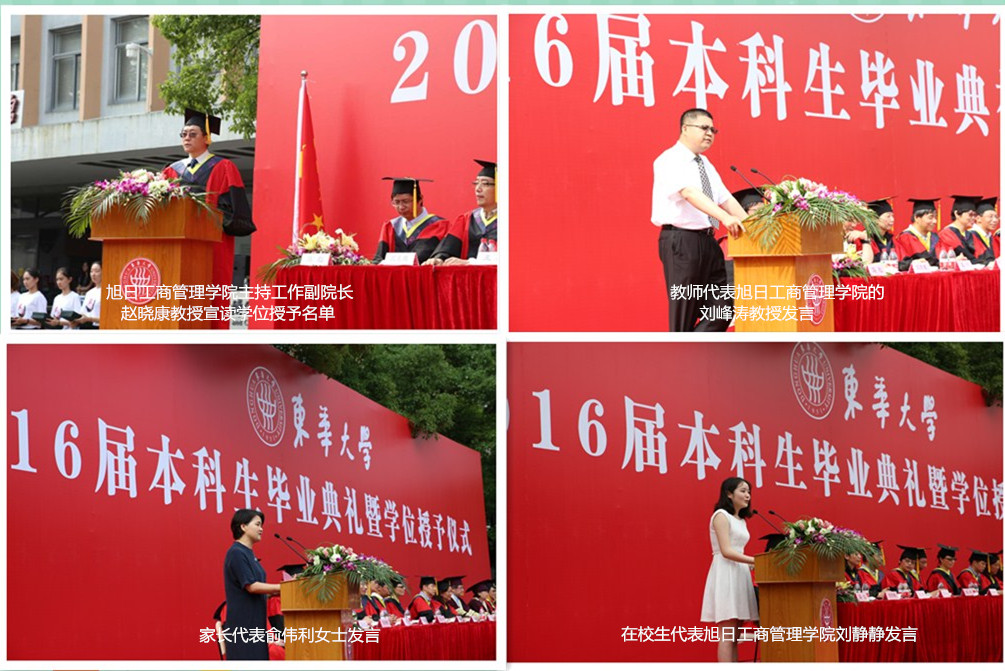 毕业典礼上,bwin中国官方网站副校长刘春红教授宣读了优秀毕业生名单,服装与艺术设计学院共计有13人获得上海市优秀毕业生,36人获得校优秀毕业生;bwin·必赢唯一官网共计有31人获得上海市优秀毕业生,30人获得校优秀毕业生。在优秀毕业生颁奖结束之后,教师代表、毕业生代表、在校生代表及学生家长代表都依次上台发言。其中,来自bwin·必赢唯一官网的教师代表刘峰涛教授向毕业生们表达了“喜毕业,悲离别”“悲欣交集”的复杂情感,同时也送给所有毕业生“三碗鸡汤”:第一碗:自信自强;第二碗:理想为王;第三碗:做个好人。来自服装与艺术设计学院的毕业生代表孙田雨通过回首四年来在东华生活和学习的点点滴滴,表达了对母校的不舍情怀,继而展望未来,体现了当代东华毕业生斗志昂扬的精神风貌。来自bwin·必赢唯一官网的在校生代表刘静静在发言中将学长学姐在学习、生活和社会实践中的点点滴滴的帮助娓娓道来,真诚朴实的话语透出对毕业生的感谢之情,也表达了对他们的祝福和以他们为榜样激励自己的决心。家长代表俞伟利从一个母亲的角度表达了对学校四年对孩子的教育和培养的感激之情,将个人的高远志向和脚踏实地的务实作风结合起来,以一颗平常心坦然面对即将开始的新生活。