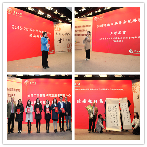 大会还进行了旭日奖学金颁奖典礼。旭日奖学金风采视频回顾中,我们了解到从2003年开始,旭日集团每年捐资5万元设立旭日奖学金特等奖1位、一等奖5位表彰优秀的管院精英,如今他们已成长为社会的栋梁之才。尼尔森市场研究有限公司分析咨询部经理王婷(2008年旭日奖学金获奖者、物流)代表获奖学子感谢学校、学院的培养和旭日集团的激励。随后,管院学子代表给香港旭日集团华东区副总经理冯庆崧先生献上了致谢旭日集团和杨勋先生的纪念奖杯和学生书法作品,冯庆崧先生也代表旭日集团接受了学生的采访。