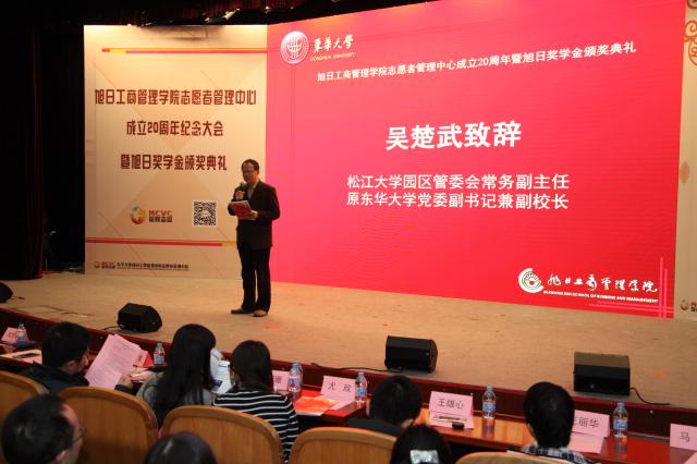 会上,松江大学园区管委会常务副主任、原bwin中国官方网站党委副书记兼副校长吴楚武致辞。吴楚武在致辞中生动地再现了当年他作为校党委副书记与爱心助老志愿团结下的深厚情缘。他提到,爱心助老志愿团是在上海老龄委支持下的上海市第一家爱心助老志愿团,是当年“上海市教育系统精神文明建设好事”。他于1998为爱心助老志愿团题词“夕阳中飘扬一面年轻的旗帜”,至今他还保留着当年与志愿团骨干接受上海东方广播电台采访的录音。二十年来,爱心助老志愿团不断发展壮大为bwin·必赢唯一官网志愿者管理中心,志愿精神在一代代管院人中传递。他对管院志管20年来在志愿者管理与人才培养上取得的突出成绩给予高度赞扬,特别感谢香港旭日集团及杨勋先生捐资助学、回馈社会的善举。希望管院学子能够继续秉持优良传统,再接再励,在志愿服务实践中彰显青春风采,促进全面发展。