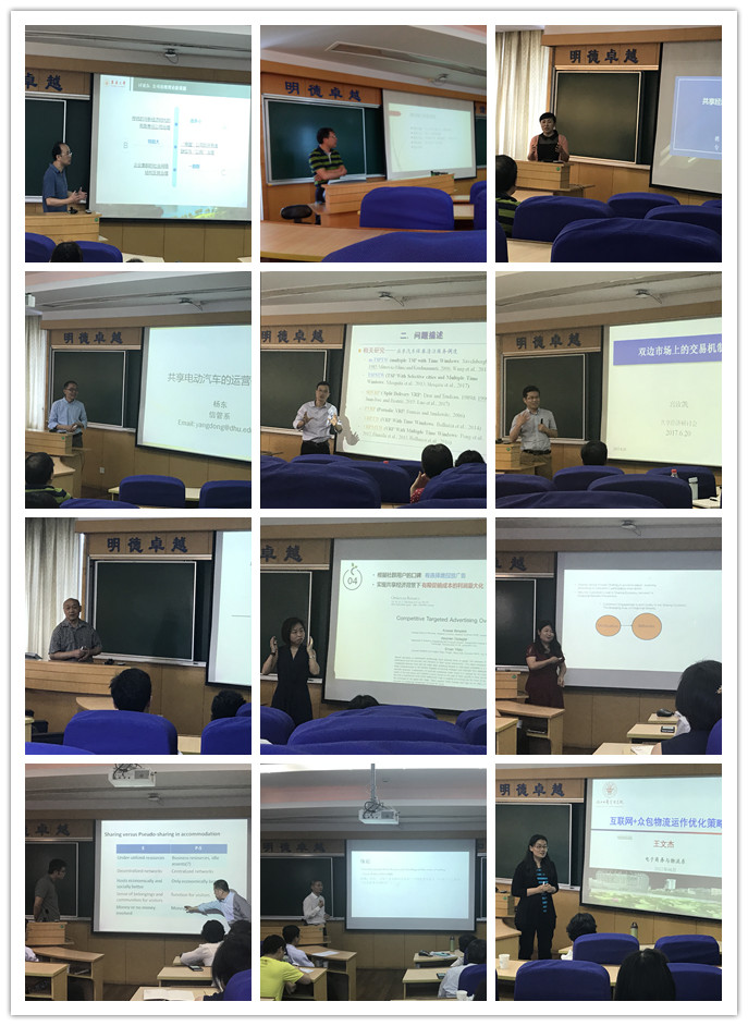 本次研讨会围绕“共享经济”为核心,邀请了24位bwin·必赢唯一官网的教师将各自的研究课题归纳成8个模块,分别是“共享租赁决策管理”、“共享经济建设服务”、“共享经济发展演化”、“共享价值计量模型”、“共享模式企业变革”、“共享经济运营决策”、“共享物流运作优化”和“共享活动客户分析”。各个领域的专业教师从不同角度共同探讨经济学领域的同一主题,展示汇报了各自相关研究成果的同时,台上台下互动交流,相互启发探讨,思想火花碰撞,讲座气氛十分热烈。