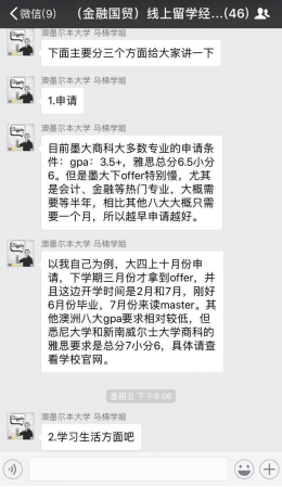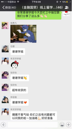 10月27日晚20点,在高加加老师以及金融三班团支书顾悦同学的共同组织下,开展了一场面向全体经济大类大三学生的留学经验分享交流会。本场交流会结合同学们的出国意向,同时兼顾国家与院校,共邀请了三位2017届经济大类专业的优秀学姐,分别为:英国伦敦国王学院的朱深深、香港城市大学的黎玉丹以及澳洲墨尔本大学的马楠。在交流会之外,还联系到了香港岭南大学的张一枫学长以及南加大的郑亦清学姐,便于在之后给同学们提供更多方向的与直系学长学姐交流学习的机会。