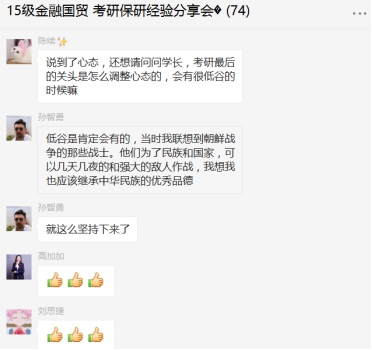 10月26日晚20点,线上的考研经验分享会率先展开,参与人数达74人。本次考研经验分享会在参考同学们的意愿之后,邀请了成功考取对外经济贸易大学的王宁学姐、中央财经大学的孙智勇学长以及武汉大学的郭蓉学姐。在主持人田君的组织下,首先同学们对学姐学长表示热烈欢迎,并积极参与互动,勇于表达心中疑惑,得到了学姐学长们详细的回答。