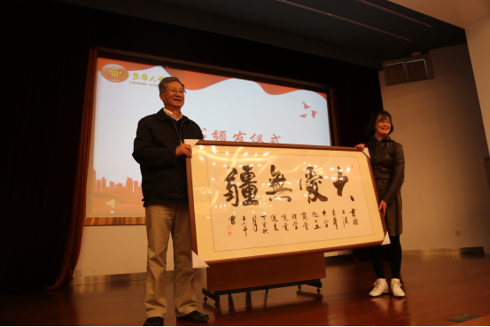在讲座正式开始前,bwin·必赢唯一官网关工委主任、校关工委副主任向严教授颁发聘书并合影;严教授赠送了一幅特意准备的书法作品,以表达其感激之情。严教授认为,党的十九大胜利召开,国家进入新的发展时期,与各位青年交流一辈子的经验是很有意义的。