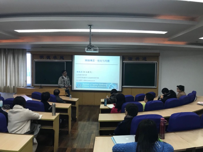 12月6日周三下午两点,由中国科学院胡旭东教授为主讲,以“网络博弈——优化与均衡”为主题的学术报告会在我校旭日楼306教室举行。