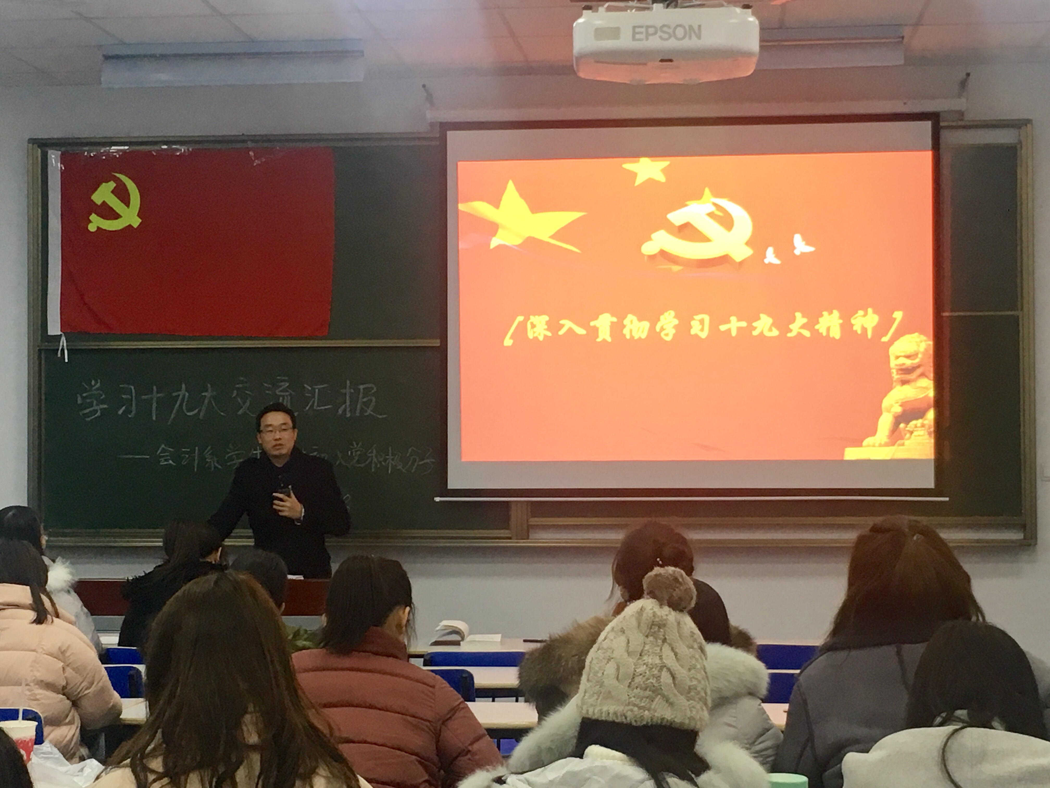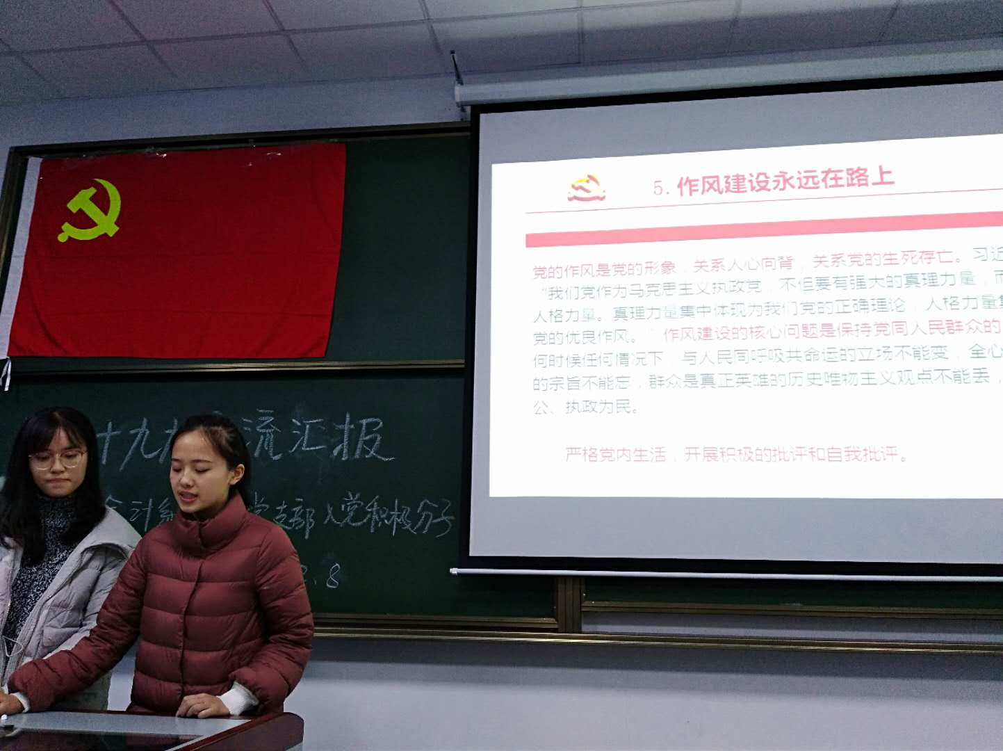 学习贯彻党的十九大会议精神是当前的首要政治任务。十九大闭幕后,会计系学生党支部积极组织入党积极分子们开展相关的学习活动,经过筹划,支部入党积极分子经过前期充分自学、后期小组讨论和深入思考,最后将小组所学、所思和心得体会进行汇报,形成相互学习、相互促进的学习氛围会计系学生党支部目前共有积极分子53名,汇报以小组代表交流,每组8分钟,共十组,通过PPT演示将小组学习情况进行了汇报。有的小组将对十九大报告、党章的修改和习近平新时代中国特色主义思想等方面的学习感受进行了汇报交流。也有小组从“文化自信”、“四个意识”、“从严治党”等为切入点展开学习汇报。其中,杨佳仪代表小组进行交流汇报给人印象深刻,她举了大量的实例,让学员们深刻地体会到党章的内容与大学生日常生活密切相关。能将十九大报告的新思想、新观点很好地与大学生生活点滴相结合,解读十九大精神非常值得学习。习近平新时代中国特色社会主义思想也是各小组汇报最多的,说明当代大学生对于党的最新理论成果非常关注,牢固树立了“政治意识、大局意识、核心意识和看齐意识”。有小组能够结合大学生的具体情况,提出应该“行在当下”,在勤奋学习、对党忠诚、遵规守纪上做好表率,引起了大家的共鸣与反思。叶阳天代表谈到了真人版电影《花木兰》翻拍选人、我校民乐团赴肯尼亚的表演,说明弘扬中华优秀传统文化的重要意义,也提出了在坚定文化自信的过程中,如何避免走向文化自卑和文化自大等。