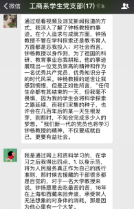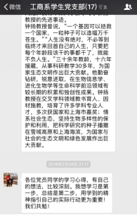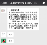 2018年2月28日晚20:00,bwin·必赢唯一官网工商系学生党支部以线上讨论的形式举行了围绕学习钟扬同志的先进事迹的组织生活会。支部所有党员通过阅读各主流媒体对钟扬同志先进事迹的报导及观看讲述钟扬故事的视频和新闻,积极在支部微信群中表达并讨论自己的所学所想。