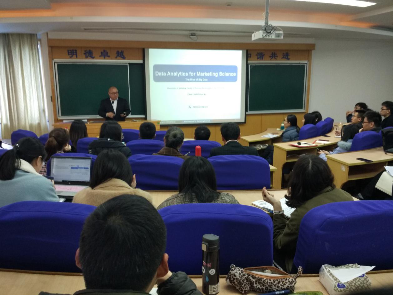 李振博士从自己对Marketing和Marketing Science的定义入手,提出做Marketing Science的研究关键乃科学的方法及客观的数据。随后李振博士阐述了大数据在营销领域应用的大趋势,详细介绍了大数据的概念、结构和来源,并通过自己的研究,向大家展示大数据在营销研究中的应用,包括展示了基于地理信息、人口密度等信息对于零售商选址的重要作用;通过网络爬虫软件提取消费者购物侧信息、在线购物决策信息;从店内购物车定位的路径信息来分析消费者购买决策过程和改变商店陈列的作用;以及通过眼动仪捕捉消费者眼球运动信息来分析“商铺差评对销量比起好评更有影响力”的作用机理。李振博士的讲座引发了师生们对大数据应用的热烈讨论,激起了学生对学习大数据分析的强烈兴趣。