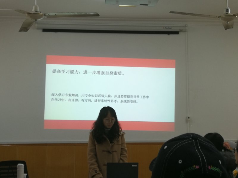 班会的序幕由两位高年级学姐拉开,他们先从当代青年的主要任务——“学习”出发向全班同学提出了具体的学习建议。马晚路学姐为同学们综合介绍了信管专业的学习规划,以及大二学年各类科目的学习方法和要领,结合自己的经验讲解了如何过好大学生活,内容切实而生动。亢馨悦学姐则为在座同学强调了学习的重要性,以己为例告诫大家应当好好规划,充分利用时间,不要因为身兼数职而打乱了学习和生活的步调。