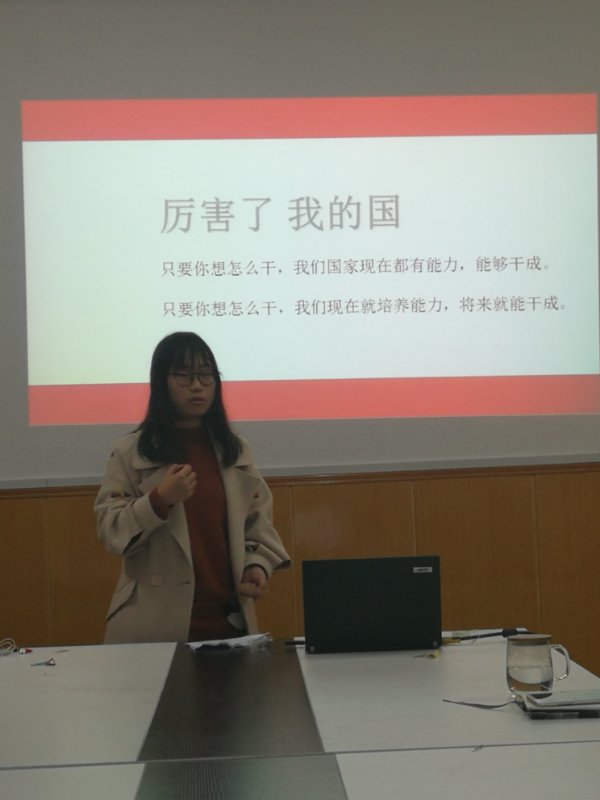 接下来,班委分别从爱国情怀、民生问题、传统文化、创新发展以及当代青年的使命等诸多方面进行了主题汇报。宣传委员陈镜竹由近来的《红海行动》《战狼》等电影,谈及《厉害了,我的国》纪录片。她引用韩少功“血沃之地将真正生长出金麦穗和赶车谣。”等句表达了自己对国家的热爱与期望,鼓舞同学们共同为这片“血沃之地”努力。团支书何美丹针对《厉害了,我的国》纪录片的三个方面进行发言。第一方面她针对国家的迅猛发展,结合大学生愿景和当下规划进行叙述讨论,现场气氛热烈,大家纷纷发表了自己的观点;第二方面她由记录片中基层扶贫的工作人员洛措谈及当代大学生对他人的关爱与帮助,大家也纷纷谈及自己做志愿活动的点滴体会与感触;第三方面她由传统文化联想到暑假团日活动大家分享的家乡照片,并在此次活动中做了分享讨论。组织委员朱梓梦不仅将网上对国内外的科技现状的对比做出了澄清,还倡议大家要对网络舆情理性发声,同时搜集了众多高科技讯息为同学们展现了中国科技创新发展的鲜活实例,图文并茂,引人入胜。班长皮雯旭结合“厉害了,我的国”以及十九大精神提出“我们到底该成为一名什么样的大学生?什么样的当代青年?”“短短的四年时间我们又该做些什么?”等问题,她为同学们分享介绍了一些自己的感悟和方法,引人深思,发人深省。