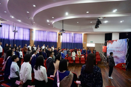 仪式开始,在主持人的组织下,党员全体起立,纷纷在左胸口戴好党徽,奏唱国际歌。国际歌展现了先辈们为共产主义事业艰苦奋斗的精神,当激昂的旋律响起,全体党员感受到了自身肩负责任之重大,必在今后的日常生活、学习工作中发挥先锋模范作用。