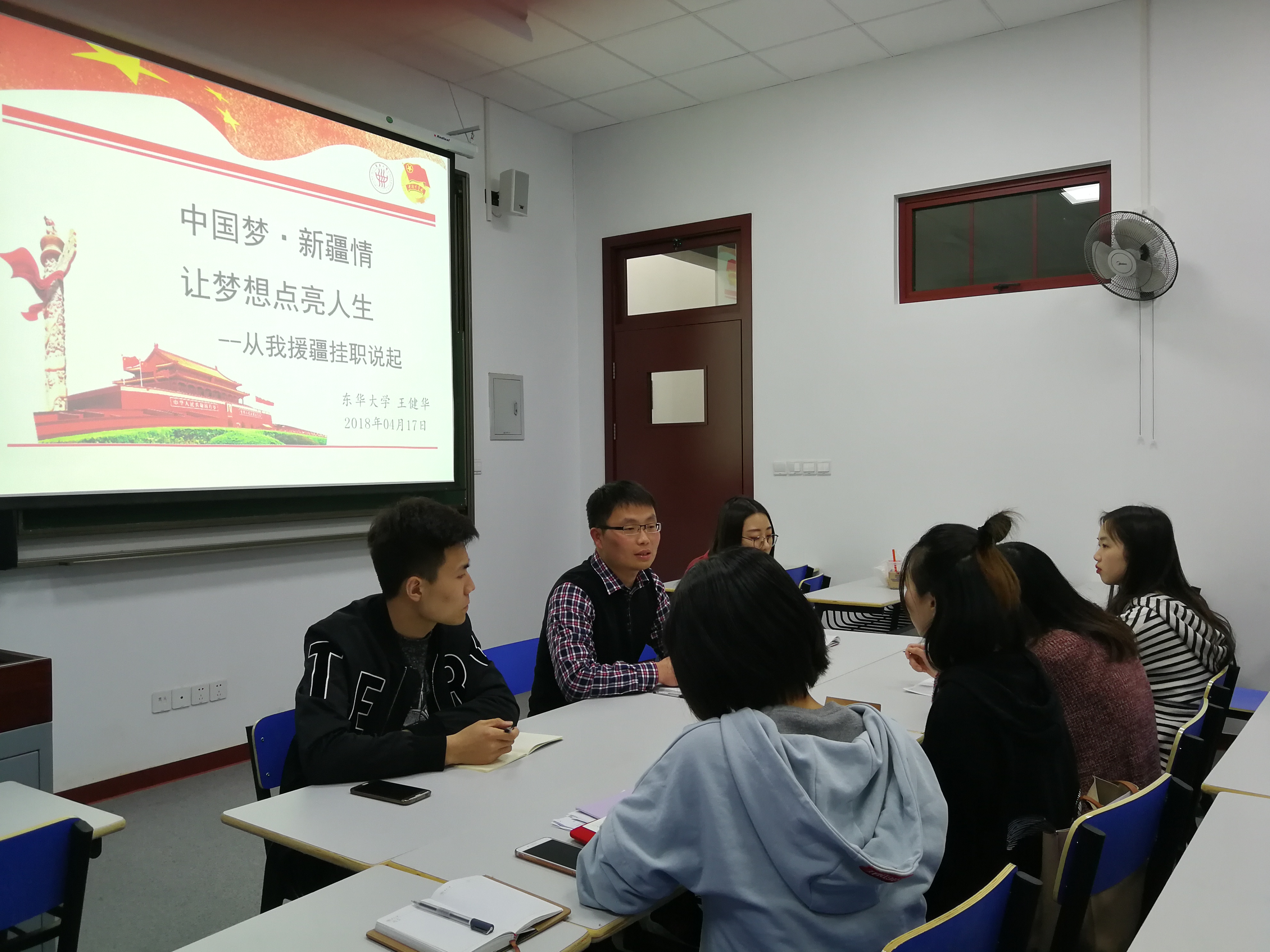 支部书记王健华老师从自己爷爷作为中国人民志愿军抗美援朝的英勇无畏事迹联系自己的援疆初衷。作为高校教育工作者更应该承担起支援西部开发和促进民族团结的责任。王老师从“我为什么要援疆”延伸到“我为什么要入党”,由浅入深,层层剖析,引发大家深入思考。大家均从入党动机、入党态度和入党初心自我剖析,追问自己是否具有明确的入党动机、端正的入党态度以及永恒不变的入党初心。