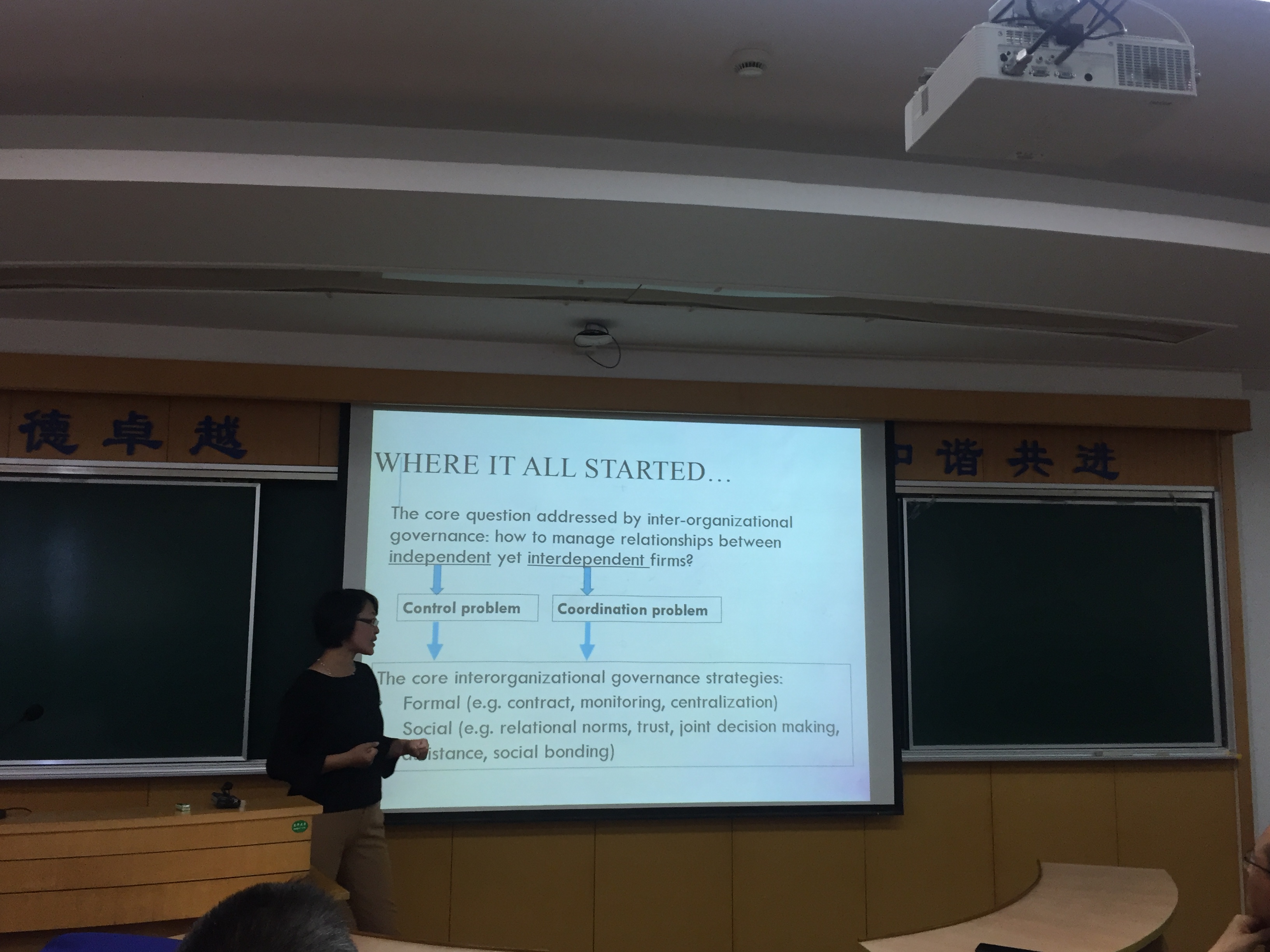 张春教授首先为大家介绍了企业间关系管理问题,文化距离,制度敌对性,交易压力对关系管理机制的影响。随后,基于美国出口商,美国汽车工业主要厂商,中国出口商和供应商收集来的数据探讨分析了出现不合作事件,企业间关系如何修复的问题。报告引发了师生们对企业间关系治理的热烈讨论,激起了学生们探索的强烈兴趣。