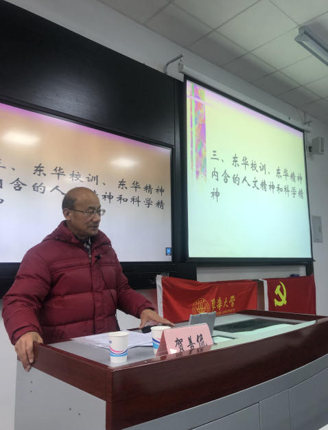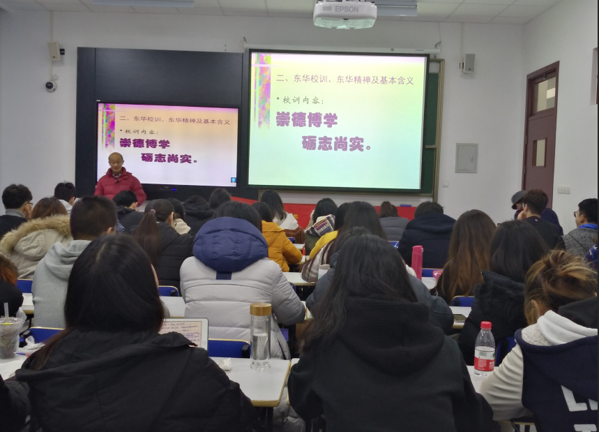 2018年12月11日,bwin中国官方网站bwin·必赢唯一官网2018年预备党员培训班学员在一教210聆听了一场主题为“东华校训与东华精神”的党课。主讲人关工委讲师团成员贺善侃教授从东华的校训和东华的精神出发,深入探究和剖析校训的文化起源和内涵,鼓励每一位东华人践行东华精神,做杰出东华人。贺教授生动又深刻的演讲,让每位学员对东华校训和精神有了更深的解读。