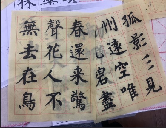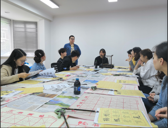 为了更好指导同学们进行书法研习,徐老师邀请了国学苑品牌项目骨干应豪同学进行现场指导。他讲述了不同字体的风格以及书写时的注意事项,并亲自示范了毛笔用笔的基本规范。随后学员们在应豪同学的指导下,在优雅的音乐中开始一笔一划地临摹书法字帖。应豪同学针对每位学员出现的书写不规范问题分别进行了耐心的指导,并示范了握笔姿势和写字技巧。在他的帮助下,同学们都有了很大进步。完成书法作品后,同学们纷纷拍照留念,相互评点学习。
