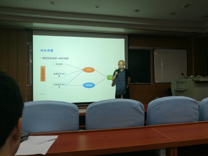 接着,郭长林副教授向同学们介绍了他的研究内容和研究结果。郭老师基于居民消费的视角,通过将生产性财政政策、价格型与数量型货币政策同时引入动态随机一般均衡模型中,从调控目标选择和政策搭配两个维度对这一问题进行系统的理论分析和实证检验。郭老师对模型的详细介绍和解释为在座师生对该方向的研究提供了进一步的了解与认识,同时也为研究该类问题提供了新的思路。