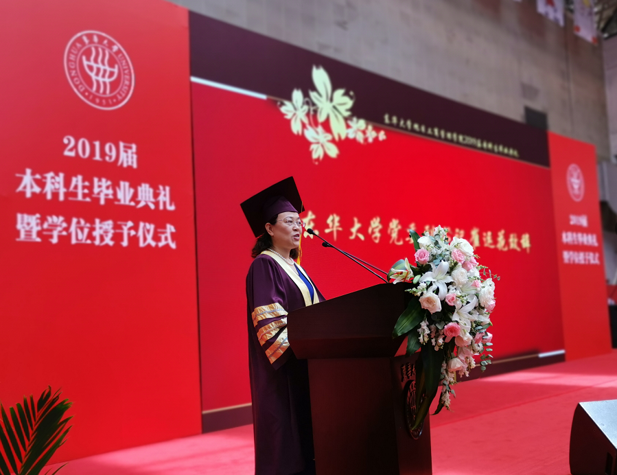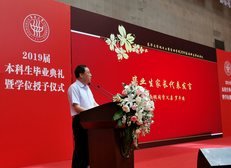 在毕业生家长发言环节,罗雨璇同学的家长感谢了bwin中国官方网站四年来对女儿的栽培,表达了对2019届本科毕业生的热烈祝贺,并向为同学们的成长倾注热情、汗水和智慧的老师及校领导们表示衷心的感谢。现场还与同学们分享了几点人生感悟,如树立终身学习的理念,同时培养独立思考能力和独立人格,还要敢于坚定信念,追求自己所爱的事情。愿毕业生们奋勇拼搏,愿东华桃李芬芳。
