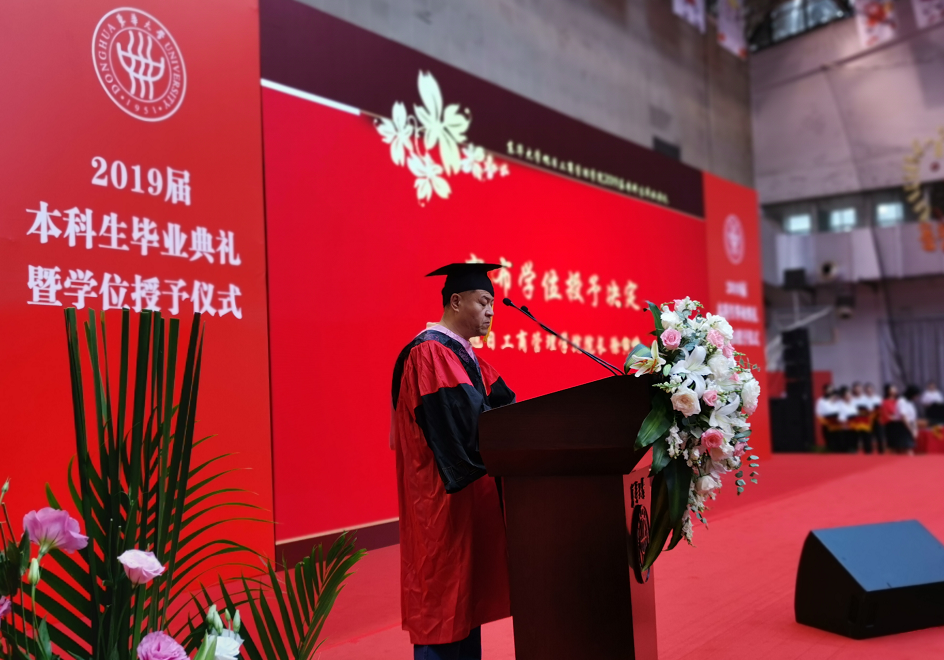 在学院教师代表发言环节,杨帅老师对毕业生们寄予了四点希望,希望同学们将“崇德博学,砺志尚实”的校训铭记于心,成为具有理性、知性与灵性,有生命信念和人生感悟的人;希望同学们能热爱生活,继续发现世界的美好;希望同学们关注、支持学校和学院的发展,努力为母校的发展添砖加瓦、献计献策;希望同学们“长风破浪会有时,直挂云帆济沧海”,愿同学们用奋斗的力量去实践青春无悔的诺言,时刻感恩,扬起风帆去创造生命中的升华。