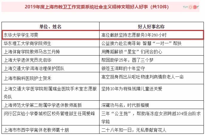 近日,2019年度上海市教卫工作党委系统社会主义精神文明好人好事和提名揭晓,我院邓雯同学获评“2019年度上海市教卫工作党委系统社会主义精神文明好人好事”。让我们一起走近这位新时代青年党员邓雯的故事,向他学习。
