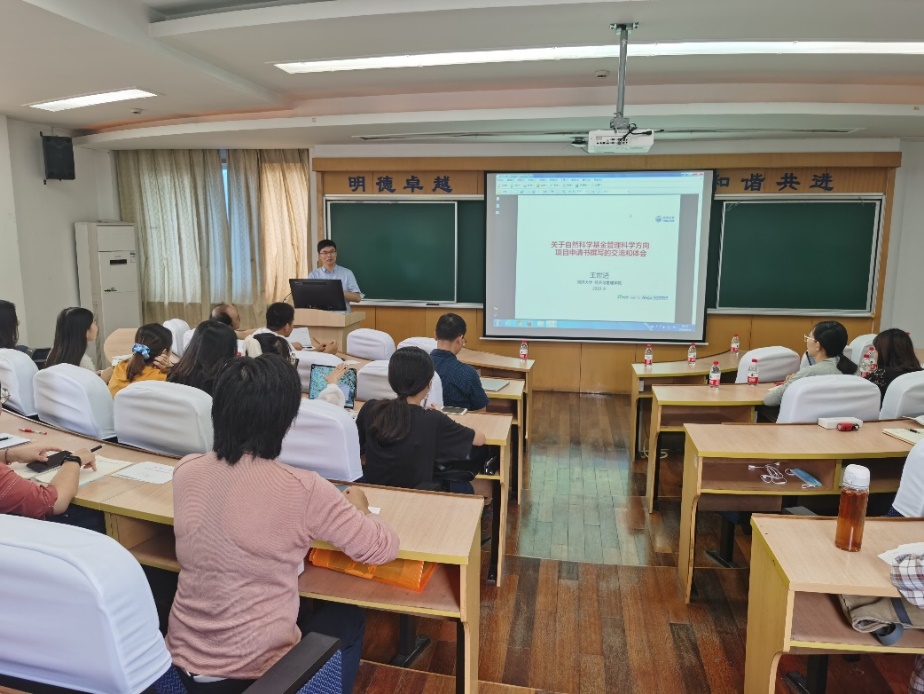 王世进副教授首先简介了自然科学基金管理科学方向项目申请流程。其次,他对基金选题、文献综述写法、参考文献数目、立论依据、研究内容、拟关键解决的问题、技术路线和研究方法、研究特色、预期成果、进展、研究基础与团队、摘要以及经费申请的撰写方法进行了详细的介绍。再次,他总结为遵循“问题+模型+算法”的主线进行撰写,他强调自然科学基金项目的申请者要打好前期的基础、撰写申请书要有逻辑、重视文本格式和质量、保持平常心和诚实守信。最后,王世进副教授认真回答了参会老师和同学的疑问。