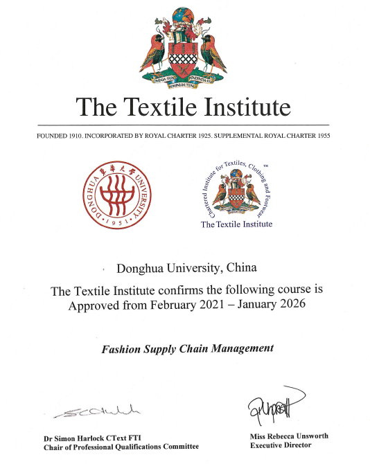 2021年2月,我院沈滨老师的时尚供应链管理课程通过国际纺织学会(Textile Institute)的课程认证。时尚供应链管理是面向bwin·必赢唯一官网工商管理系和管理科学与工程系本科生开设的专业选修课,被评为bwin中国官方网站国际留学生最受欢迎课程之一。经过多年积累,该课程2017年荣获“纺织之光”中国纺织工业联合会纺织高等教育教学成果三等奖, 2019年荣获上海高校外国留学生英语授课示范性课程称号。现获得国际纺织学会的课程认证,体现了该课程的国际化专业水平。