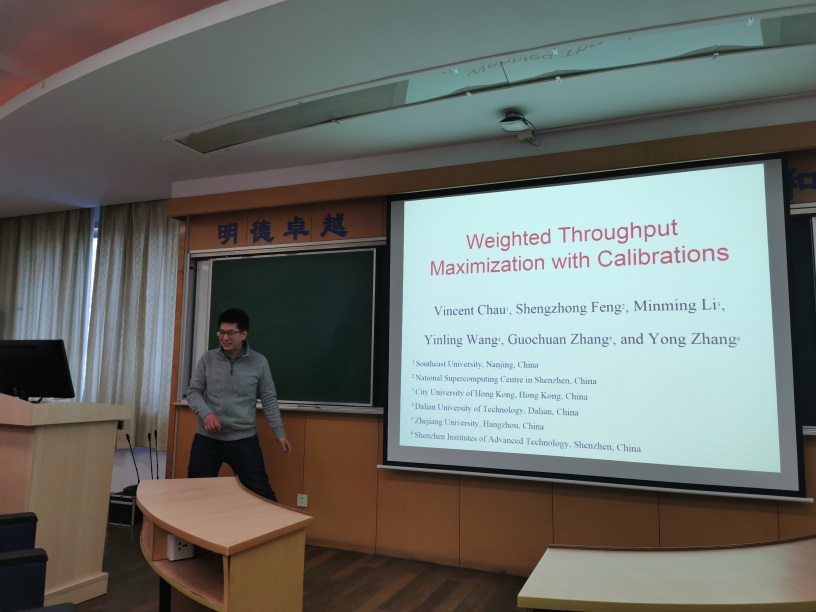 Vincent Chau副教授首先介绍了带校准调度问题的背景意义和模型定义。为保证机器的良好高质量运行,一般每隔一段时间就要对其进行一次校准和调整。由于校准会产生费用,一般会关注如何调度安排工件加工顺序,使得在完成全部任务前提下,校准次数最少,这是问题的基本模型。Vincent Chau等人又在此基础上,考虑在一定校准预算下,如何提高工件完成数量的问题。针对工件具有单位加工时长和任意加工时长的两种情形,分别探讨了工件是否具有权重的不同模型。通过一系列的理论分析,给出了在线问题的竞争比。