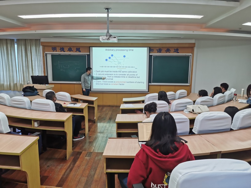 考虑校准的调度优化模型是经典的在线调度问题的有益拓展,Vincent Chau副教授的讲解深入浅出,其关于所研究问题的不同模型分析,以及最后指出的若干待解决问题,均引发了在座师生的热烈讨论和思考。