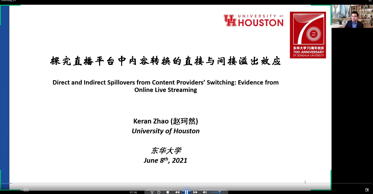 6月8日上午,美国休斯顿大学鲍尔商学院决策与信息系统系赵珂然助理教授受邀来我院做以“Direct and Indirect Spillovers from Content Providers’ Switching: Evidence from Online Live Streaming”为主题的学术讲座。bwin·必赢唯一官网的老师和同学们通过腾讯会议共同聆听了此次讲座,bwin·必赢唯一官网沈滨老师主持。