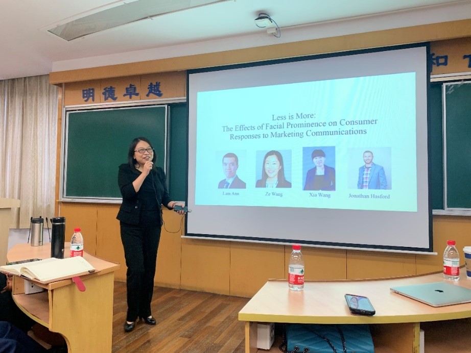 会上,毛老师提出,尽管营销传播往往以人脸为特征来增强广告说服力,但他们的研究发现代言人的面部面积在广告中的比例并不是越大越好。通过七个实验室实验和两个大型在线零售商实地数据研究,毛老师提出消费者对代言人面部不突出的广告的反应更积极。报告精彩生动,在场师生受益匪浅。