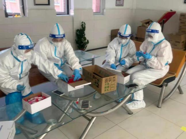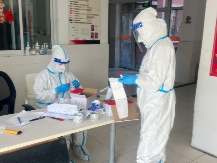 “‘疫’路守护”第八宿舍临时党支部书记、专职辅导员高加加老师、驻楼志愿教师李彬老师做核酸检测准备