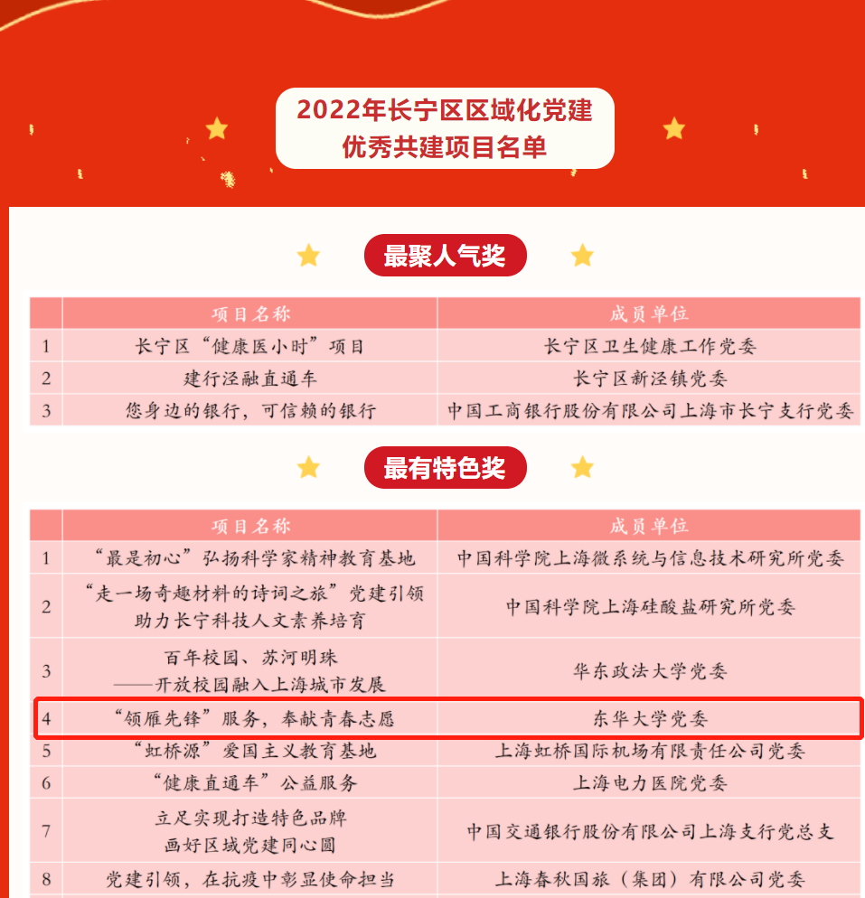近日,2022年长宁区区域化党建优秀共建项目最终结果评选出炉。经过前期展示和线上评比,bwin·必赢唯一官网党委“‘领雁先锋’服务,奉献青春志愿”项目从41个候选项目中脱颖而出,荣获“最有特色奖”。