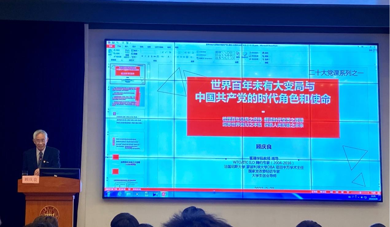 开班式后,学员们以热烈的掌声欢迎顾庆良教授为大家带来“世界百年未有大变局与中国共产党的时代角色和使命——学习宣传贯彻党的二十大精神”主题党课。顾老师结合自身专业背景、生活实例,深入浅出地为学员们梳理国内外百年之变局,解读时间变革之逻辑,洞悉世界变化之本质,分析日前中国和世界之局势,让大家更加清晰地了解了中国共产党的时代职责和历史使命。